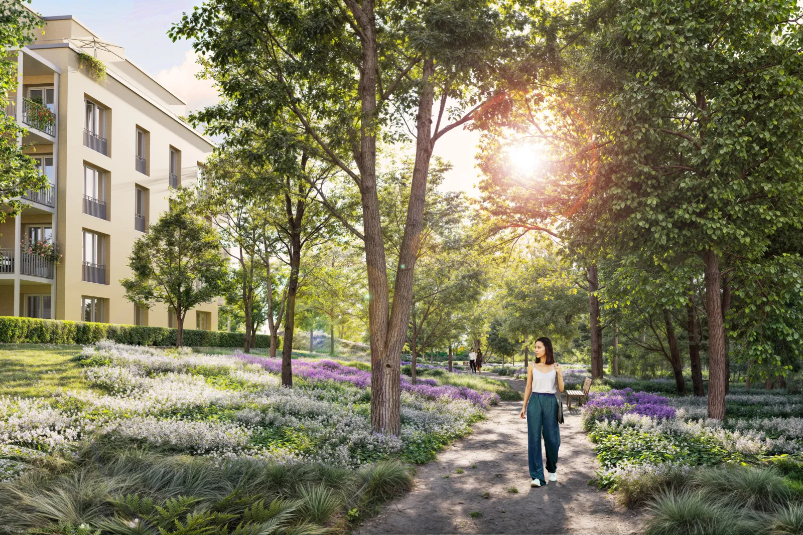 Die sorgfältig durch Gutachter und Landschaftsarchitekten kuratierten Großbaumbestände werden behutsam durch die Pflanzung neuer klimaresilienter Baumarten wie Spitz-Ahorn, Hainbuchen oder Ginkgo ergänzt. Das Parkwohnkonzept sieht über 200 Neupflanzungen vor, so dass das Gelände trotz Bebauung künftig mehr Bäume beherbergt als je zuvor. LOOP trägt so künftig zu einer augewogenen CO₂-Bilanz im südlichen Stadtgebiet Nürnbergs bei.