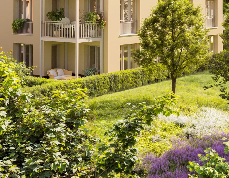 NACHHALTIGE KLIMA-REGULIERUNG Insgesamt fast 400 Bäume und eine vielfältige Pflanzenwelt erhöhen die Luftfeuchtigkeit im gesamten Parkwohnquartier. Sie spenden mit ihren Blättern im Sommer Schatten. Im Winter, wenn die Blätter gefallen sind, erreicht die wärmende Sonne die Fassaden. Dadurch reguliert sich das Klima im Freien sowie im Inneren der Gebäude im Wechsel der Jahreszeiten ganz natürlich und unterstützt so nachhaltig einen effizienten Energiehaushalt.